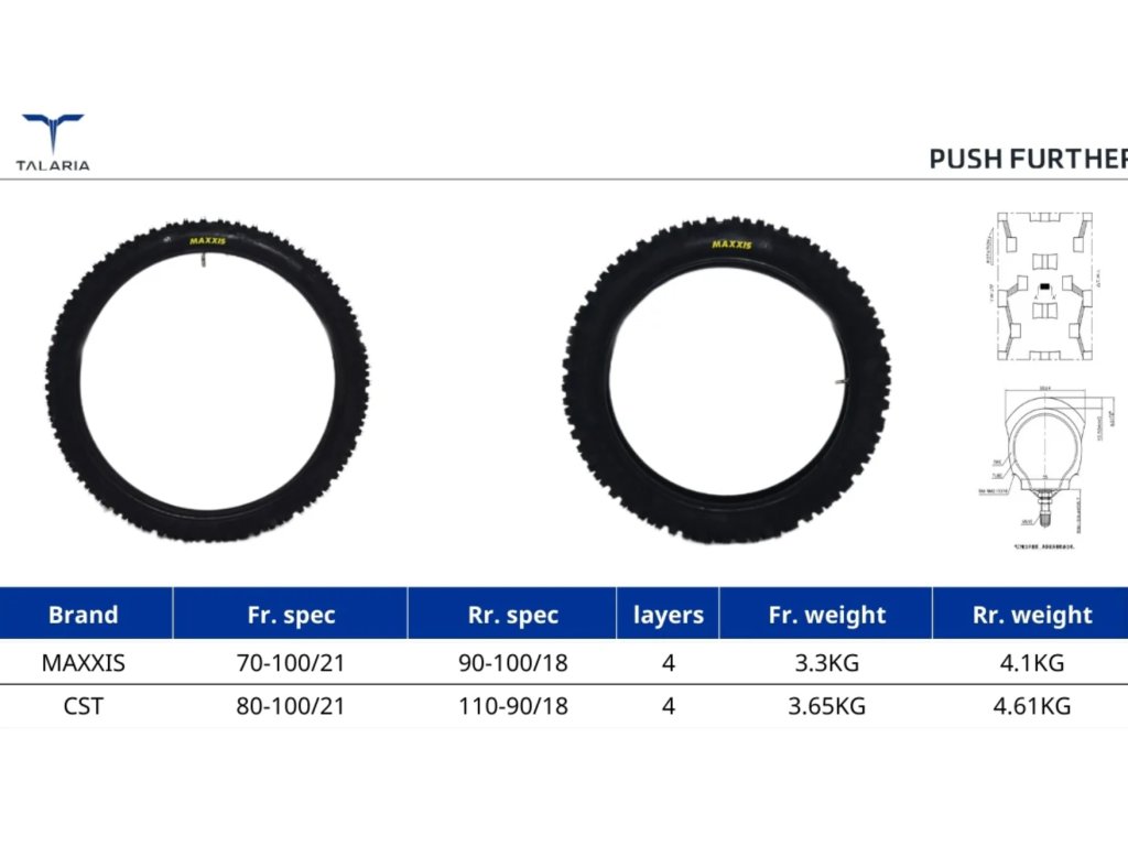 - Pneumatiky: Přední: 70/100-21; Zadní: 90/100-18 (Maxxis Knobby)